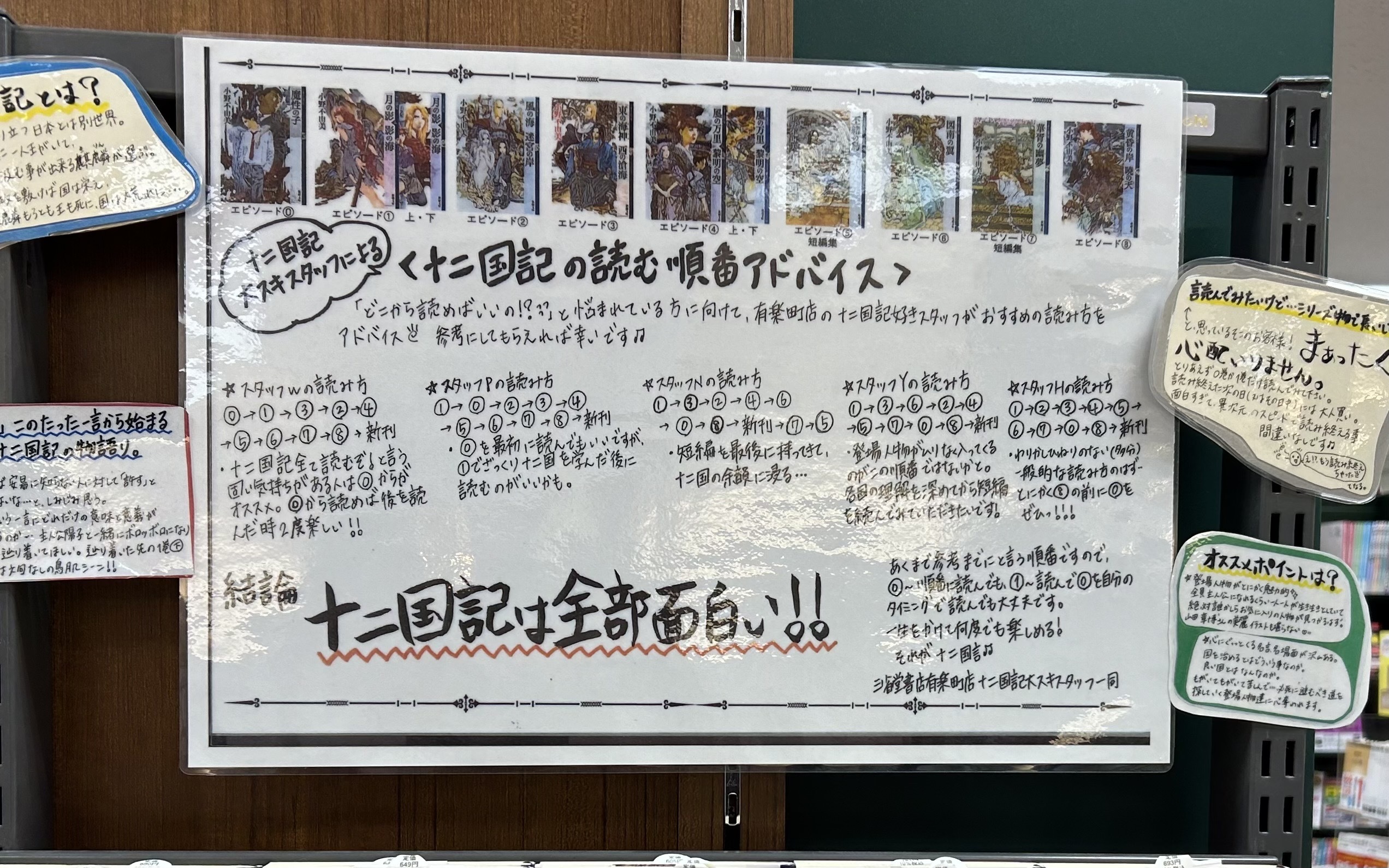 そのため、もっと作品を気軽に読んでもらえるように、『十二国記』のコーナーには店舗のスタッフさんがおすすめする「十二国記の読む順番アドバイス」というPOPを掲載しています。