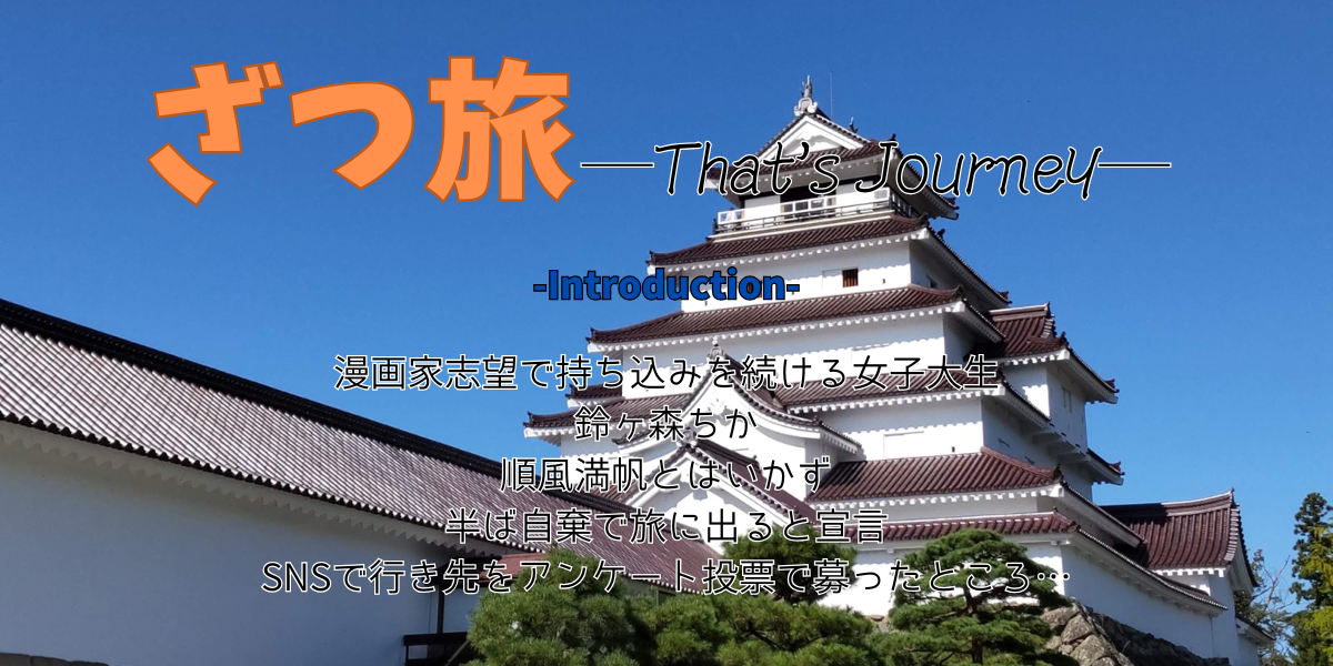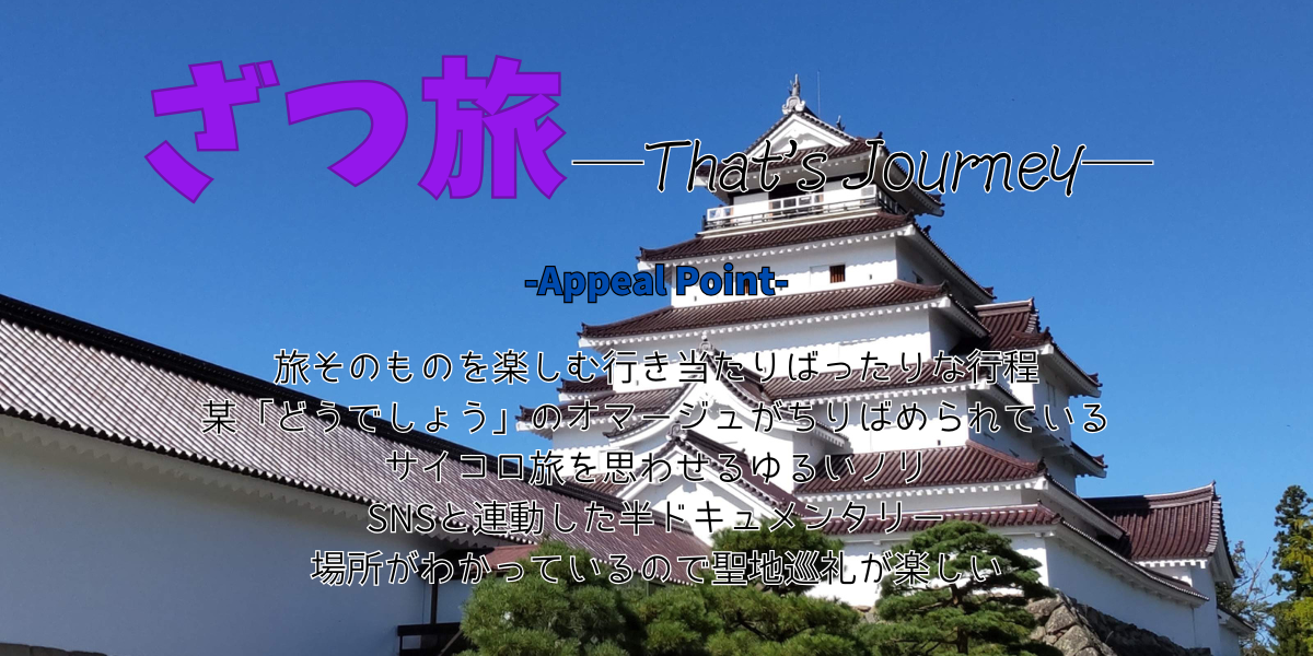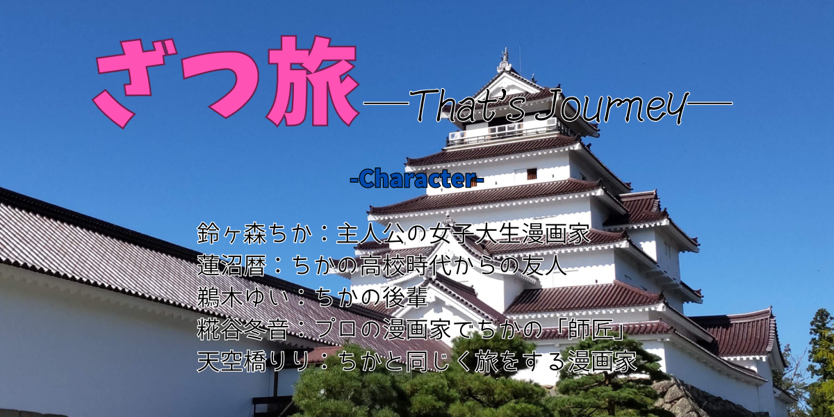 無計画に旅する設定からわかる通り、タイトルの「ざつ」とは「雑」で意味はそのものズバリ「雑な旅」。同時に英語の副題「That's」もかかっていて、行き当たりばったりで思いもよらない出会いをする作品の内容を指して、「それこそが旅」という意味にもなっています。