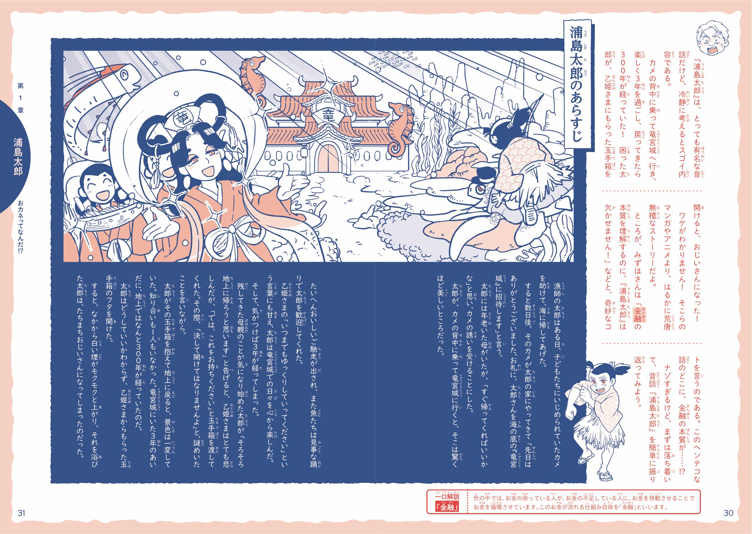 第1章では、『さるかに合戦』『浦島太郎』『ごんぎつね』からおカネの価値や考え方の話を学べます。