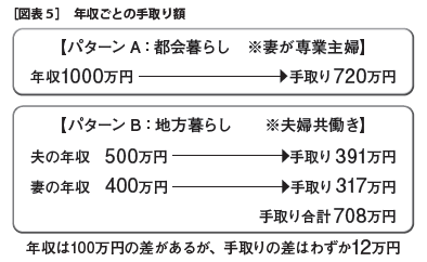 この夫婦が地方に転職して共働きをし、夫が年収500万円、妻が年収400万円になったとします。すると、夫の手取り額が約391万円、妻が約317万円で合計708万円となり、年収1000万円のときと約12万円しか変わりません。