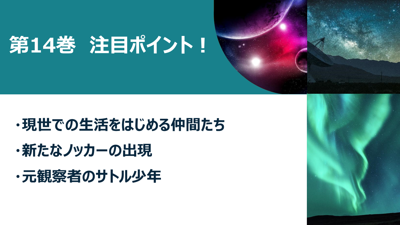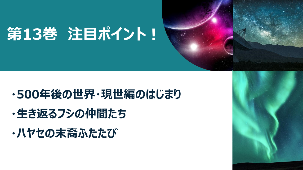 13巻からは現世編へ。フシが願った平和な世界がそこにはありました。その姿を見て、美しいと喜ぶフシ。みんなの夢を叶えるため、それぞれの故郷で生き返らせます。フシもまた観察者からのほうびとして世界と一度切れても再接続できる力を与えられるのでした。