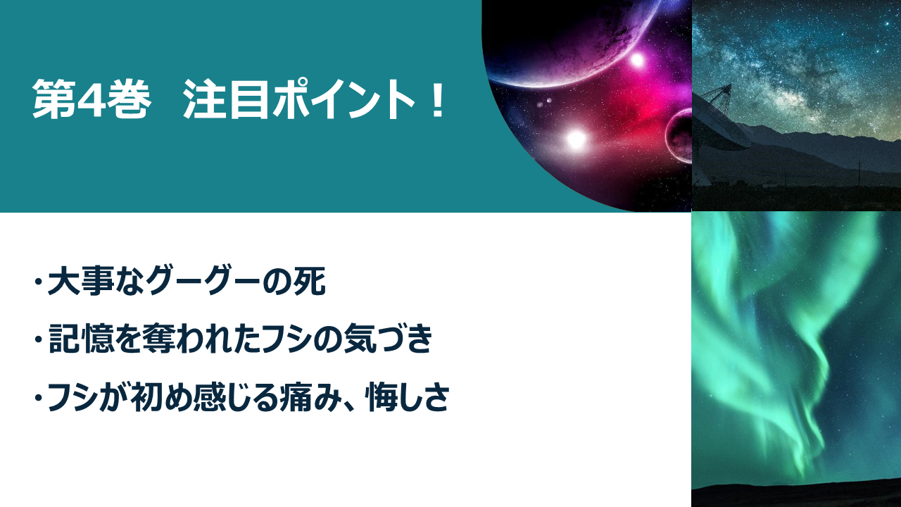 4巻では、平和な日常に訪れた悲劇、そして自分の記憶を奪われたフシの気づきが印象的です。