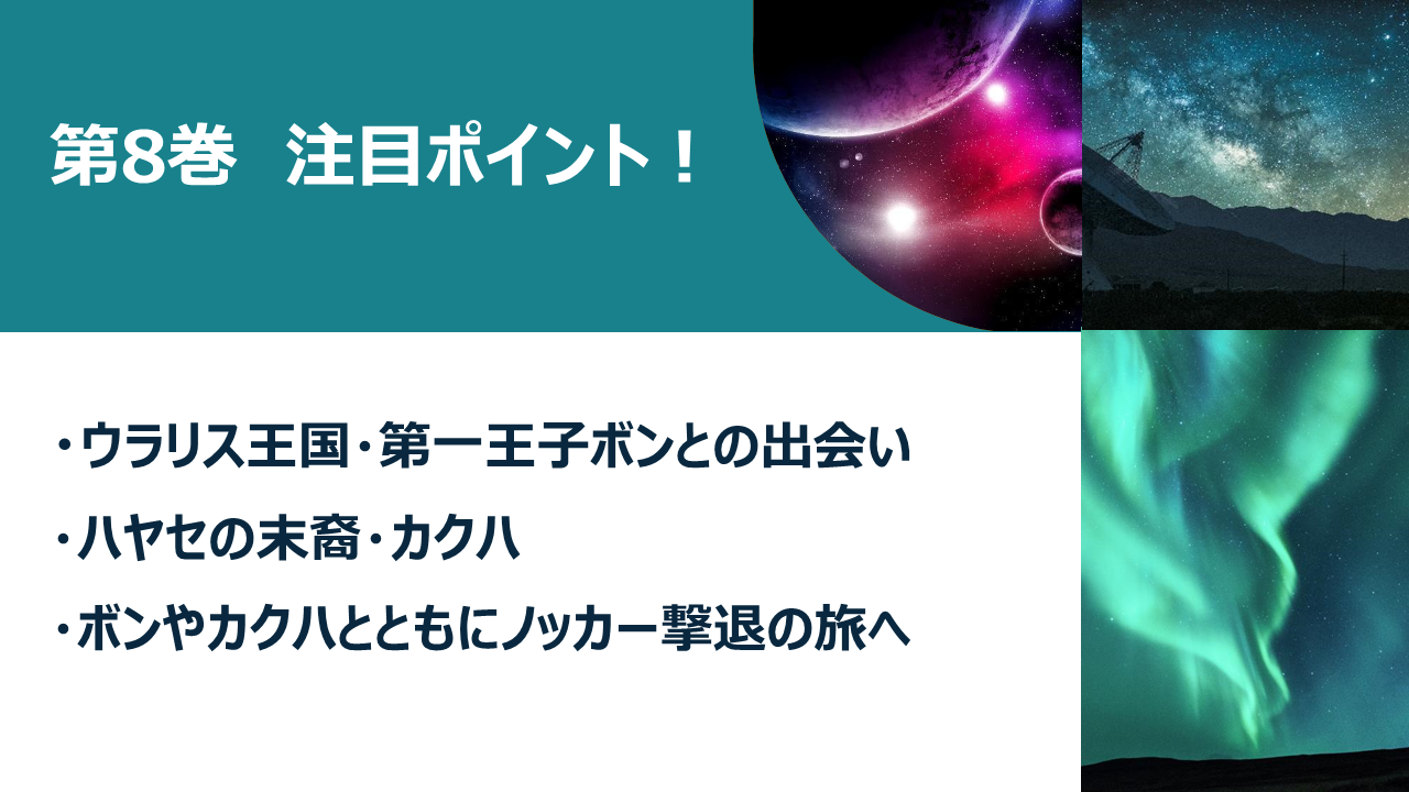 8巻からはウラリス編です。ウラリス王国の第一王子であるボンシェン・ニコリ・ラ・テイスティピーチ=ウラリス(以下ボン)に捕まったフシと守護団。ハヤセの末裔でフシの守護団を率いる6代目のカハクとともに、ウラリス王国へやってきます。