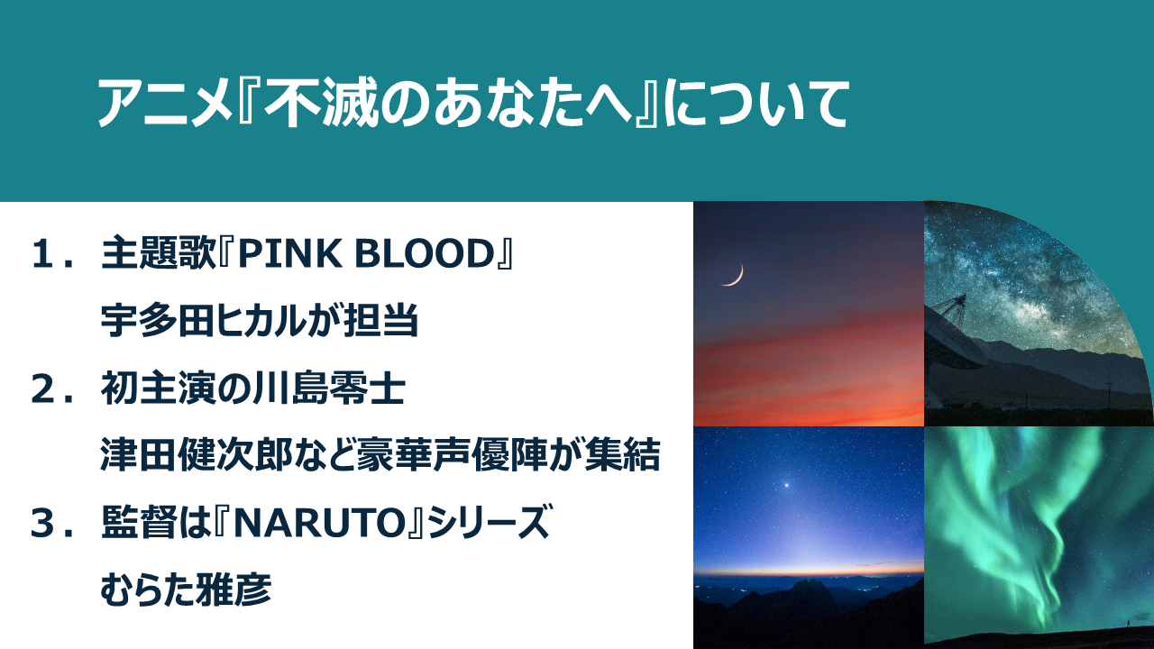 dアニメストアにて行われた2021年春にスタートしたアニメの中で「一番感動したアニメ」アンケートで見事1位に輝いた作品が『不滅のあなたへ』です。そんなアニメ『不滅のあなたへ』は、NHKEテレにて2021年4月より放送が開始されました。