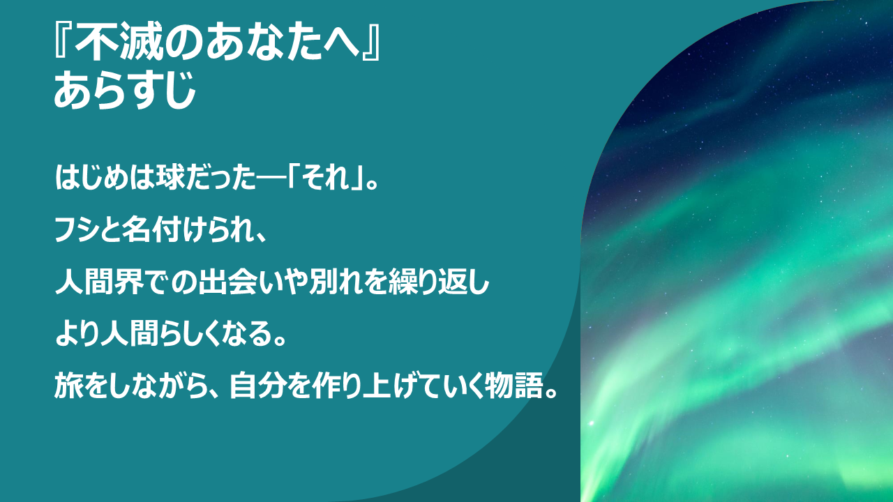 『不滅のあなたへ』で描かれていくのは、球だった「それ」=「フシ」が、「成長」しさまざまなものを「知る」ということ。徐々に人としての感情を獲得していく主人公・フシが自分とは何なのか、なすべきことを見出していく姿を感動的に描いています。