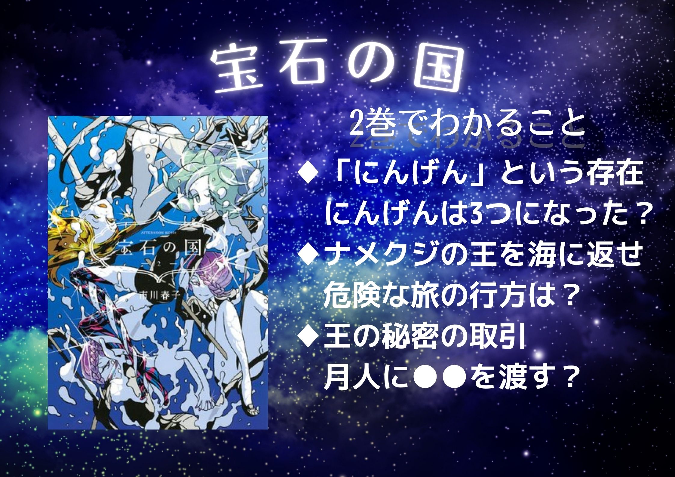 その昔「にんげん」という生き物がいたこと、星欠けた6度目に彼らは海に入り、徐々に魂と骨と肉に別れて進化していったこと、アドミラビリス族はそのうちの肉であること、他の生物と契約して進化した骨はおそらく宝石であること、清らかな新天地を手に入れ、肉と骨を取り戻そうとしている魂は月人であろうということ。