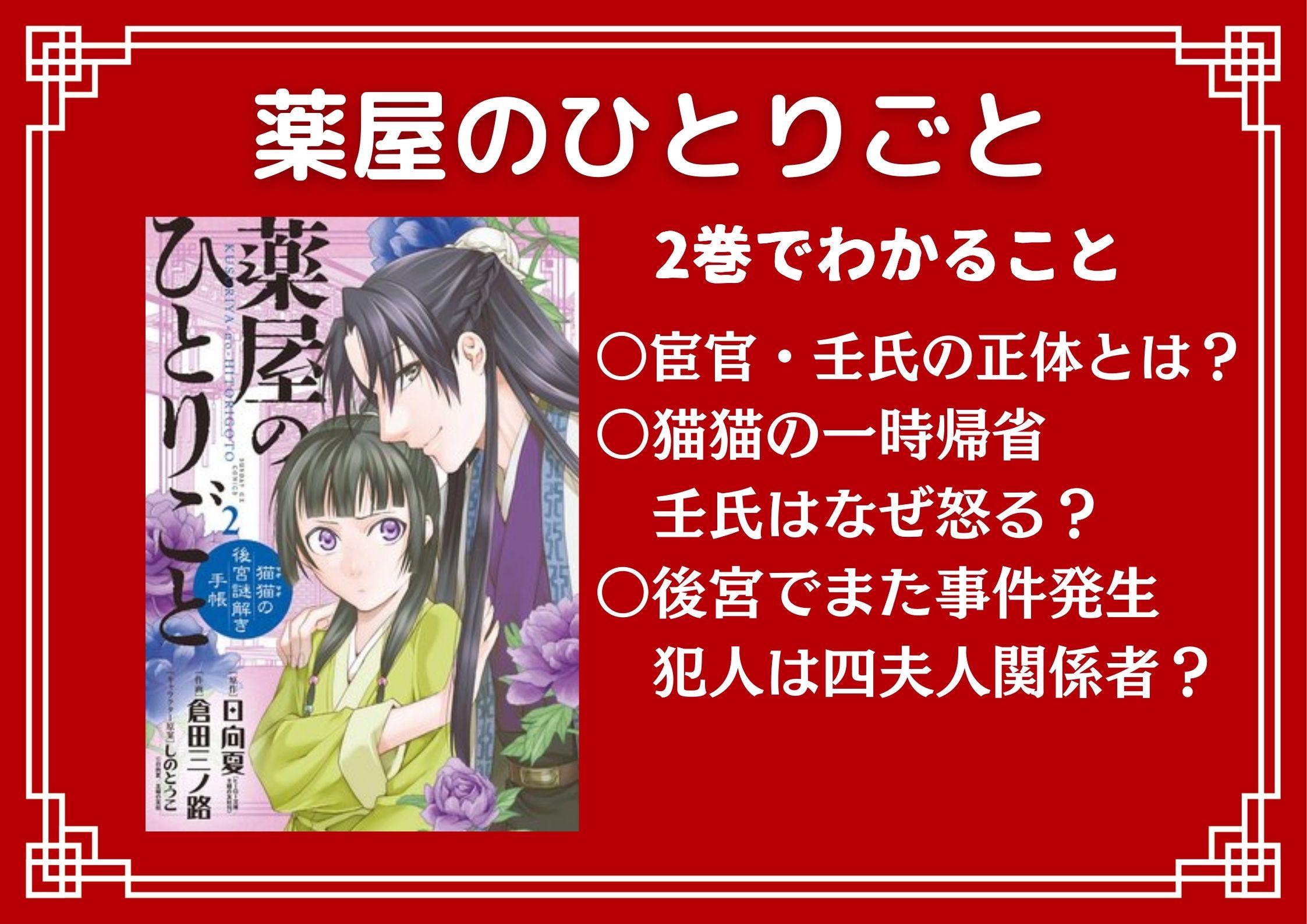 宮中で起きていた不可解な事件の数々。それが一つにまとまったとき、犯人の狙いが見えてくる!?狙われていたのは壬氏?そしてその犯人とは?複雑化する事件に猫猫も苦戦するかもしれません!