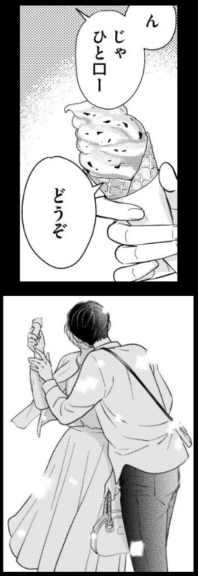 1巻の見所は何といってもキスと2人の初めての夜、ドキドキの2場面が揃っていること。注目はデートのシーンです。味見で一口食べてもらおうと舞衣子が晴海に変わった味のソフトクリームを差し出したつもりが、まさかの舞衣子にキス。舞衣子は思わない出来事に赤ら顔になってしまいます。
