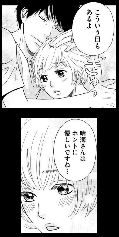 気持ちが追いつかずセックスができないと舞衣子が焦る場面があります。「こういう日もあるよ」(『年の差婚』1巻より引用)と晴海は受け止めてくれます。また、胸が小さいと悩む舞衣子。「そのままの舞衣子さんがオレは好きだよ」(『年の差婚』2巻より引用)と舞衣子の不安を取っ払うのです。男性らしさを見せつつ、包容力も感じられます。