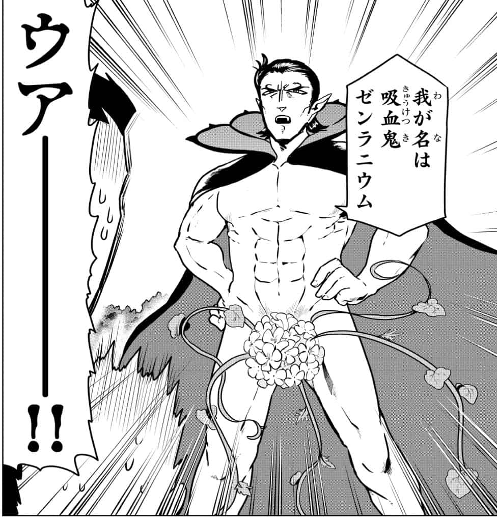 まずは「吸血鬼ゼンラニウム」。彼は全裸にマント一枚だけを羽織り、股間にもっさりゼラニウムの花を咲かせているという変態吸血鬼です。最初期に登場した吸血鬼で、植物だけに根強い人気があり、準レギュラーとしてたびたび登場しています。